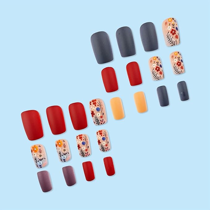 - Fashion for Spring Colorful Flower Nails Manicure: Elegant press on nails medium square contains 12 sizes, total 24 pcs of medium square nails