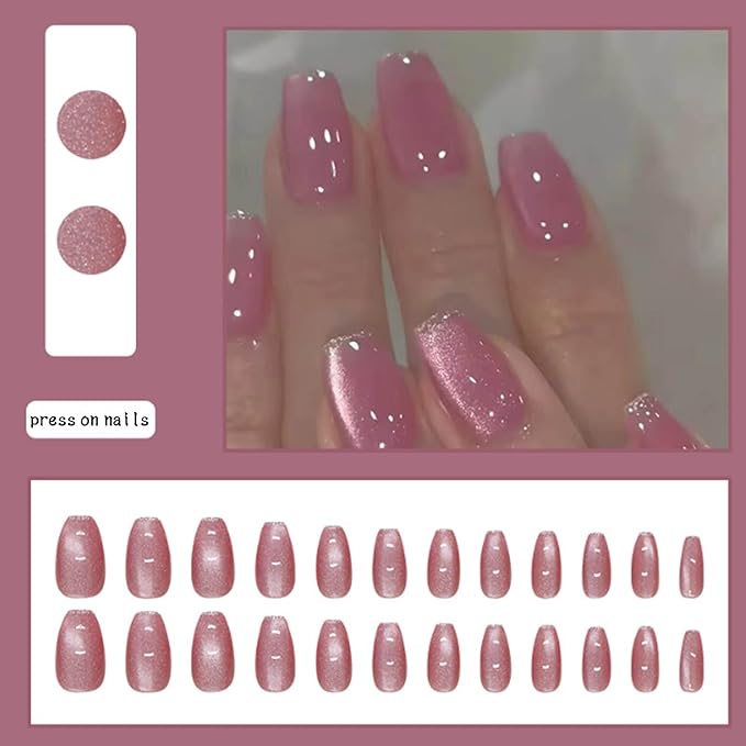 Hkanlre Coffin Press on Nails Pink Fake Nails Tips Full Cover Almond False Medium Cat Eyes Nails for Women 24PCS
