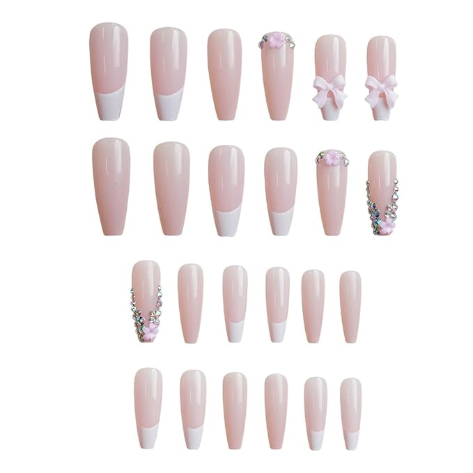 French Tip Press on Nails Long Square Fake Nails with 3D Bow Rhinestones Designs Glossy Cute False Nails Flower Charms Acrylic Nails Reusable Glue on Nails for Women Girls 24Pcs