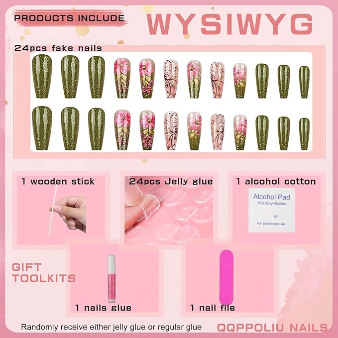 Long Press on Nails Coffin Fake Nails with Flower Design Acrylic Nails Glitter Glue on Nails for Women 24pcs