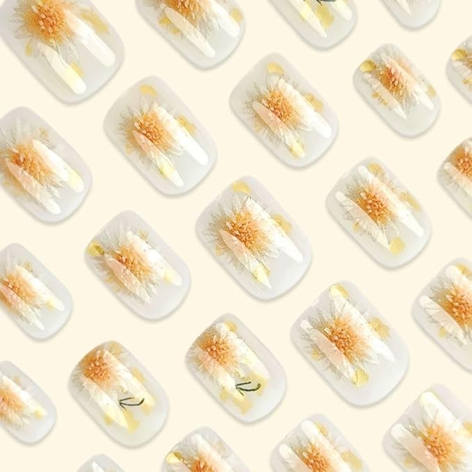 Short Square Press on Nails White Fake Nails with Flower Design Spring False Nails for Girls and Kids 24pcs