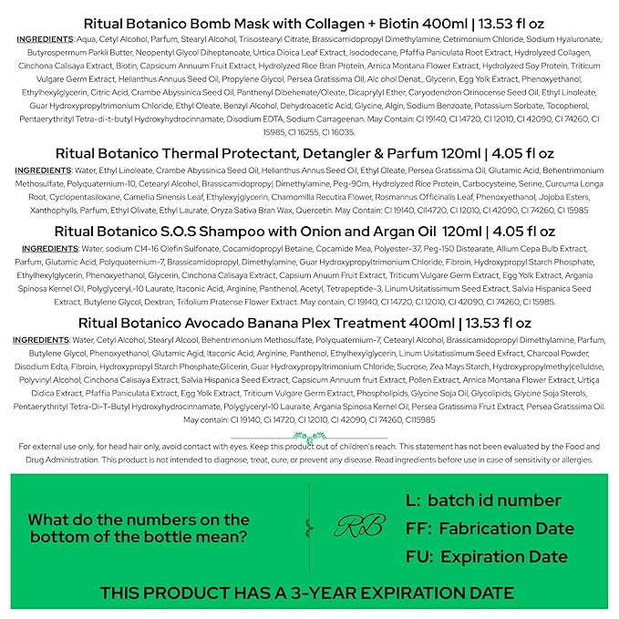 - Includes: Termoprotector | Collagen + Biotin Bomb Mask | Onion SOS Shampoo | Avocado Tratamiento Intensivo Plex Conditioner