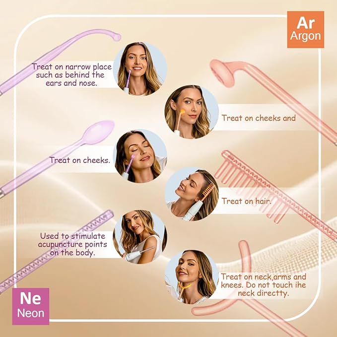 - 6 Professional Applicators for Targeted Results: Face, body & scalp solutions in one kit: mushroom head for full-face revitalization, Y-shape wand for neck/arms, comb for scalp stimulation, tongue/bent tubes for precision areas, and rod applicator for larger surfaces.