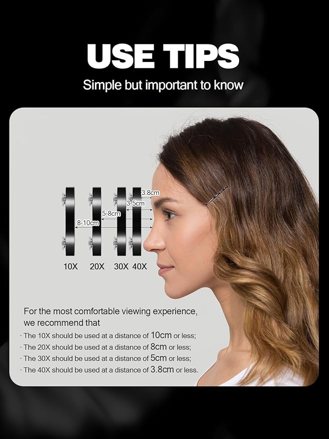 - Helpful tip: Due to the nature of magnifiers, stay within 3.5 inches of the mirror when using a 10X mirror, and stay within 2 inches of the mirror when using a 40X mirror