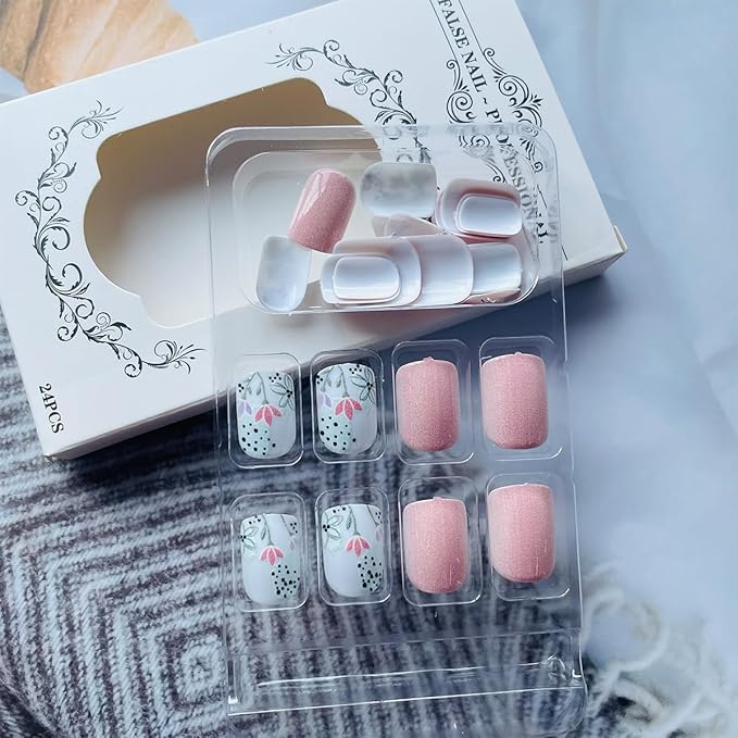 - Flower Fake Nails Kit: 24Pcs short press on nails, 24 pieces of jelly glue, 1 mini nail file, 1 wooden stick. (Durability of jelly glue is not as good as liquid glue, but it makes reusable stick on nails . Please use your suitable glue according to different scenes)