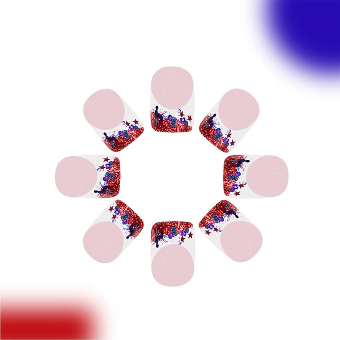 - Short French Tip Nails Kit: You will get 24pcs 4th of july short press on nails in 12 sizes + jelly adhesive tabs, nail file, and wooden stick. Designed for short to medium natural nails, these full cover stick on nails ensure a seamless fit. Use jelly tabs for temporary wear (up to 7 days) or liquid glue for extended durability, perfect for quick DIY manicures at home
