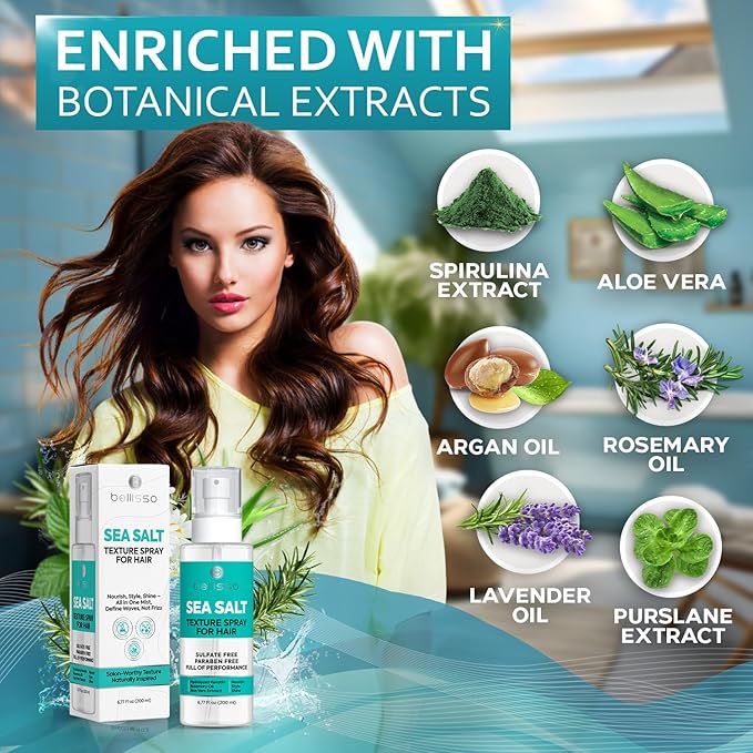 - NOURISHMENT ROOTED IN BOTANICALS: Bellisso’s salt water spray for hair is enriched with argan, castor, and rosemary oil to deliver deep hydration and a luminous, healthy shine. Experience a sea salt spray for hair women and men trust for smooth volume, soft texture, and refreshed movement. Finish your look with a sea salt texture spray for hair that leaves strands visibly nourished and never dry or brittle.