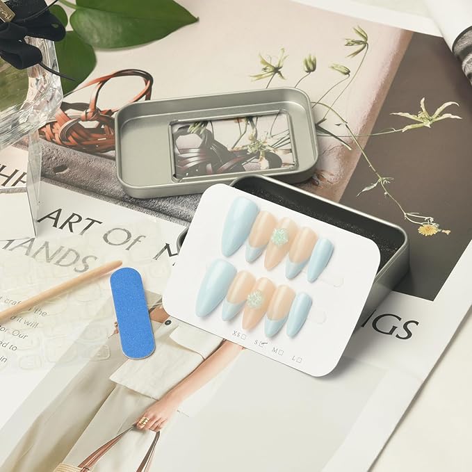 - Complete Kit: 10pcs + Extras: Get: 10 reusable handmade almond nails (S/M), 48 adhesive tabs, mini file & wood stick. Came in a reusable tin can! Apply in 5 mins – no tools needed. Open, fit, go!
