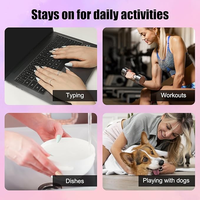 - Work, Date, Gym – Stays On Anywhere: Suitable for daily activities such as washing dishes, typing, dating, running marathons, or working out at the gym. Strong hold for busy lifestyles – no midday fixes. Your nails keep up with YOU.