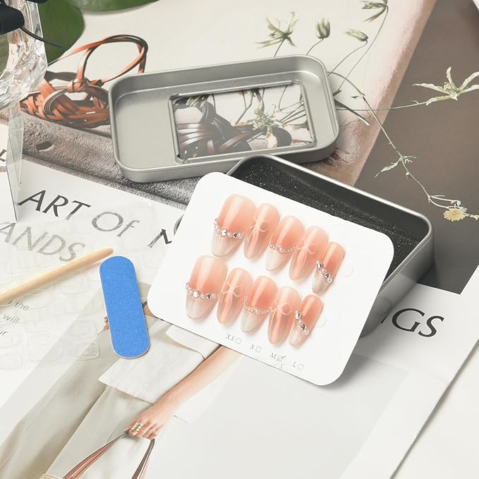 - Complete Kit: 10pcs + Extras: Get: 10 reusable handmade almond nails (S/M), 48 adhesive tabs, mini file & wood stick. Came in a reusable tin can! Apply in 5 mins – no tools needed. Open, fit, go!