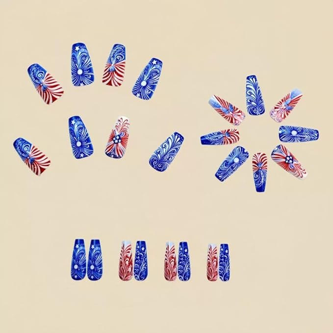Long Press on Nails Coffin Fake Nails Blue False Nails with Design Full Cover Nails for Independence Day 24pcs Kit