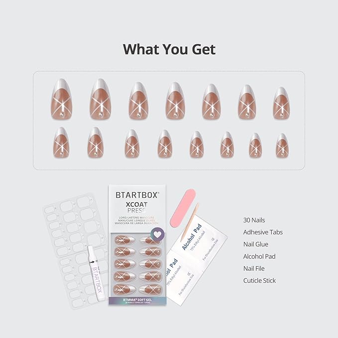 BTArtbox French Tip Press On Nails - Lamp-Curable Pearl Accents Chrome Almond Press On Nails with Glue for Women, Soft Gel Glue On Nails in 15 Sizes - 30 Stick On Nails Kit, Heel Click