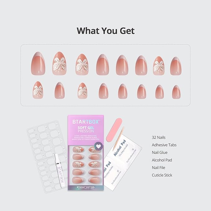 BTArtbox Press On Nails Short - 3D Butterfly French Tip Almond Press On Nails with Glue for Women, Opaque Soft Gel Glue On Nails in 16 Sizes - 32 Stick On Nails Kit, Last Dance