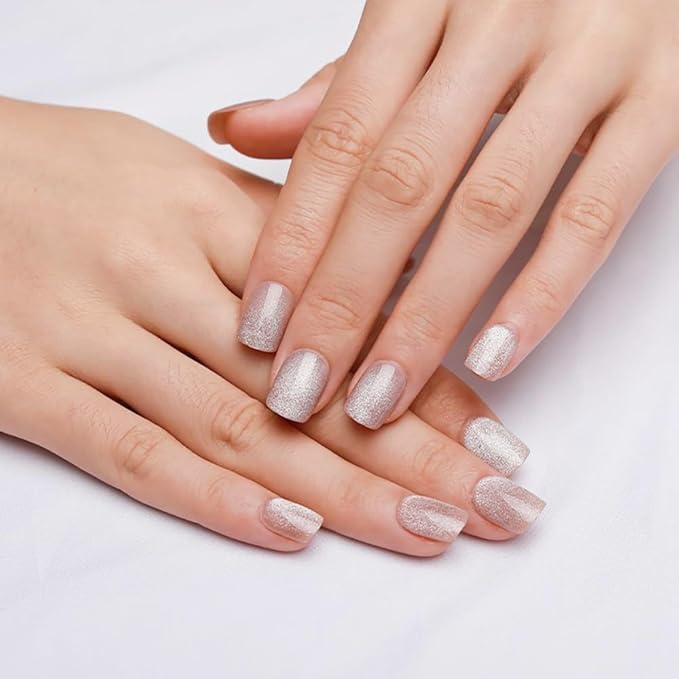evpct Nude Cat Eye Extra Short Press on Nails Square, Petite Short Square Glue on Nails for Women Gift, Champagne Metallic Glitter Glossy Reusable Stick Gel Press on Acrylic Fake Nail with Designs