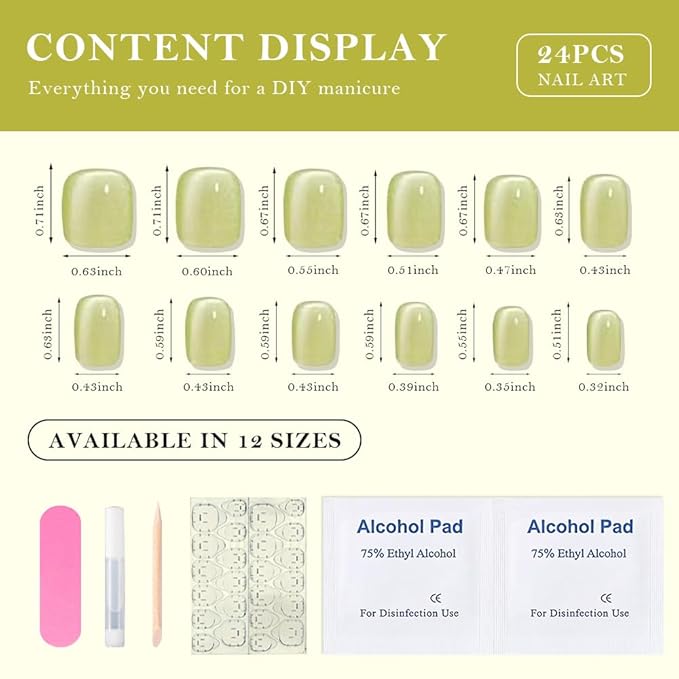 evpct Light Green Cat Eye Extra Short Press on Nails Square, Petite Short Square Glue on Nails for Women Gift, Avocado Metallic Glitter Glossy Reusable Gel Press on Acrylic Fake Nail with Designs