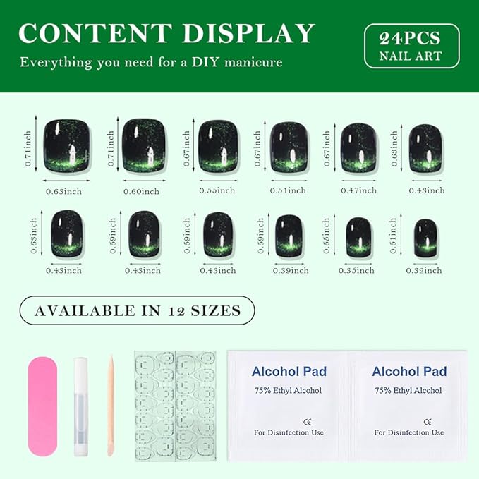 Dark Green Cat Eye Extra Short Press on Nails Square, Petite Short Square Glue on Nails for Women Gift, Smile Light Green Metallic Glitter Glossy Reusable Gel Press on Acrylic Fake Nail with Designs