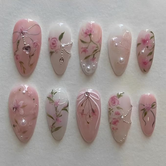 24Pcs Pink Flower Press on Nails Medium Almond Fake Nails Peach Blossom with Heart Rhinestones Glitter Design Full Cover Handmade Press Ons Stick on Nails Acrylic False Nails for Women Manicure Salon