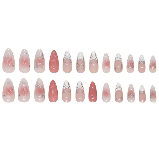 - Package Contains: Our bow press on nails designs pink false nails is exquisite and beautiful. It contains 24 pcs almond fake nails and a set of DIY nail art tools. There are 12 different sizes of fake nails. You can choose the most suitable white french tip fake nails for yourself.