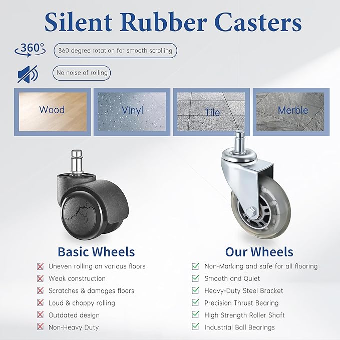 - Rolling Smoothly——360° Swivel caster and ultra-quiet wheels allow for easy movement.Soft polyurethane wheels can prevent scratches on your floor.Easy to assemble/disassemble.