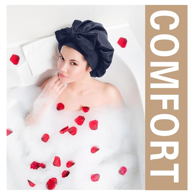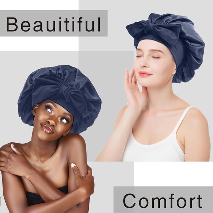 Silk Bonnet for Sleeping Women, Ajustable Hair Bonnet for Curly Hair with Tie Band Shower Caps Bark Blue,Large