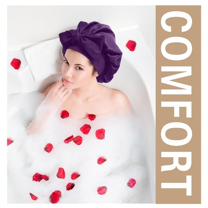 Silk Bonnet for Sleeping Women, Ajustable Hair Bonnet for Curly Hair with Tie Band Shower Caps Lilac,Large