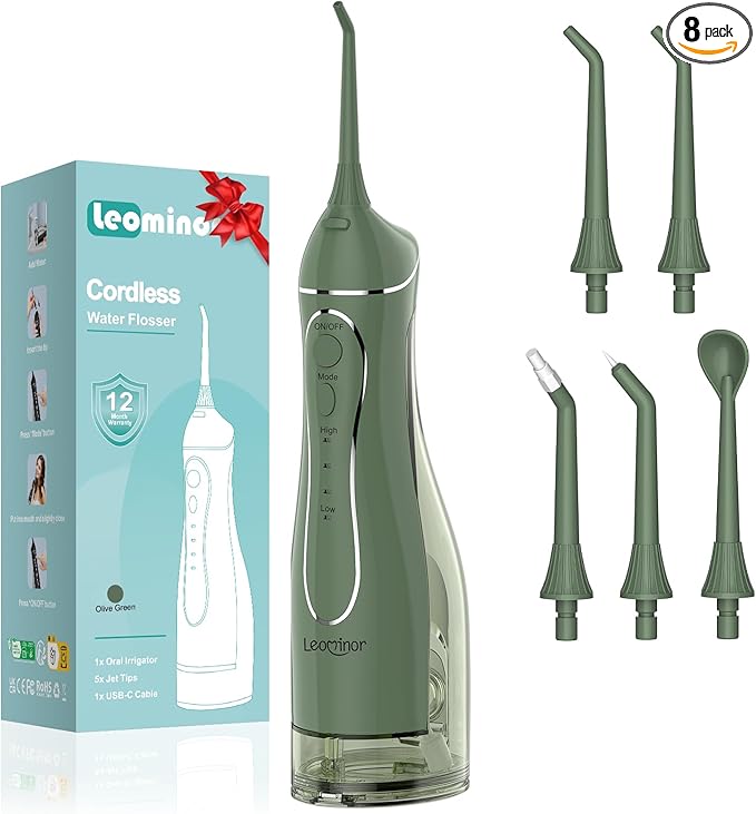 - 【 Portable & Powerful Battery Life 】30-DAY Long Battery Life, USB Fast Charing. Say goodbye to frequent charging! Leominor portable water flosser boasts a 30-day long battery life, meeting your long-term usage needs with a single charge. Additionally, our wireless water flosser is compact and lightweight, making it easy to pack in your suitcase or backpack. Whether for daily use or travel, it's your best companion