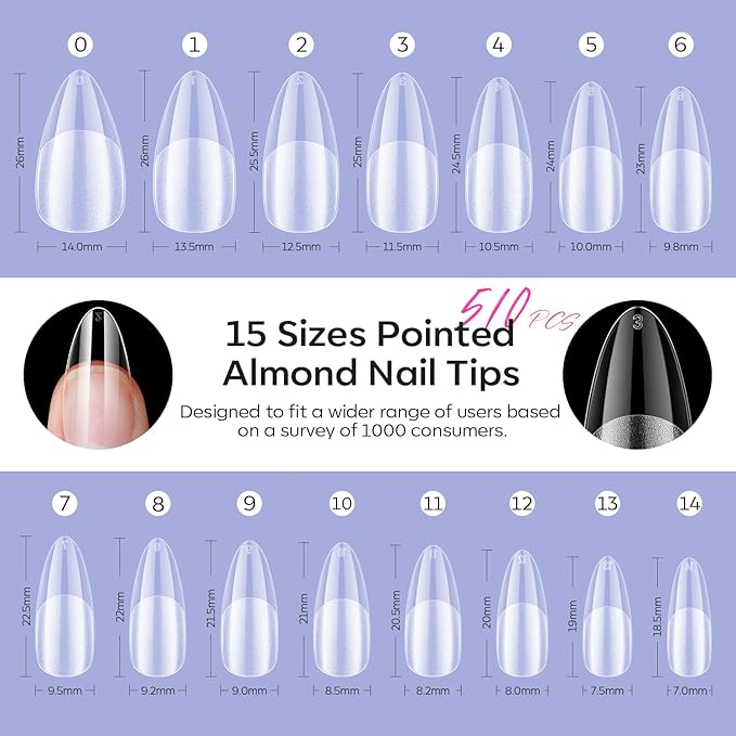 Modelones Pointed Almond Fake Nail Tips - 510Pcs Medium Gel Tips Pre-shaped Half Matte Full Cover Clear Acrylic Gel Kit False Press on Nails for Extension DIY Salon 15Sizes
