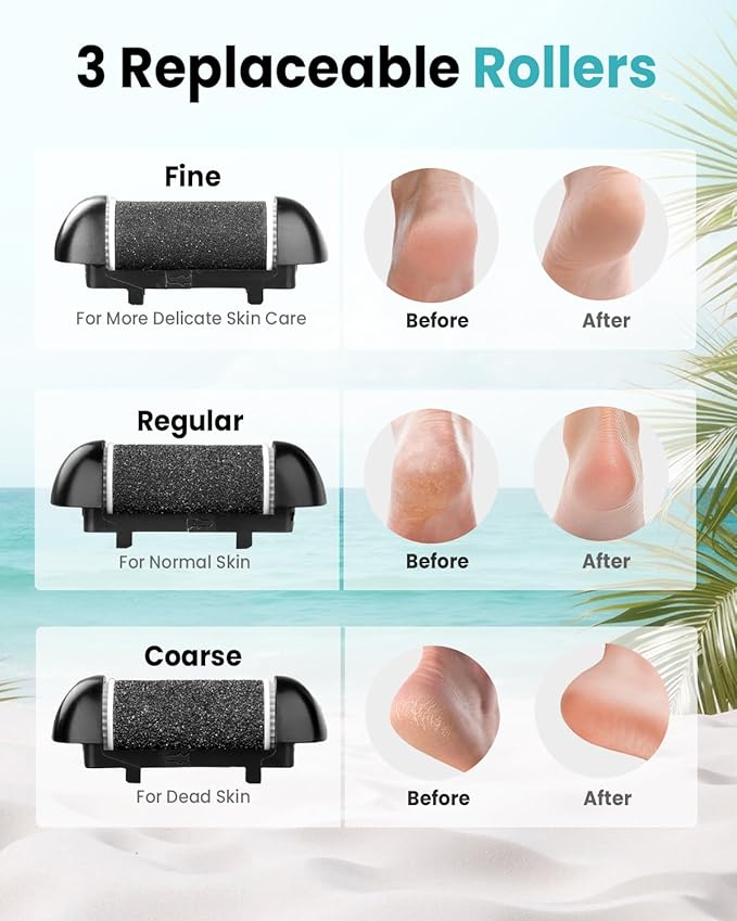 - 🌀 Multi-Head System with 3 Adjustable Rollers: Includes coarse, medium, and fine sander rollers and extra heads for every skin type—from rough heels to delicate solesmooth touch-ups. Easily select your desired level of exfoliation with this professional-grade tool.
