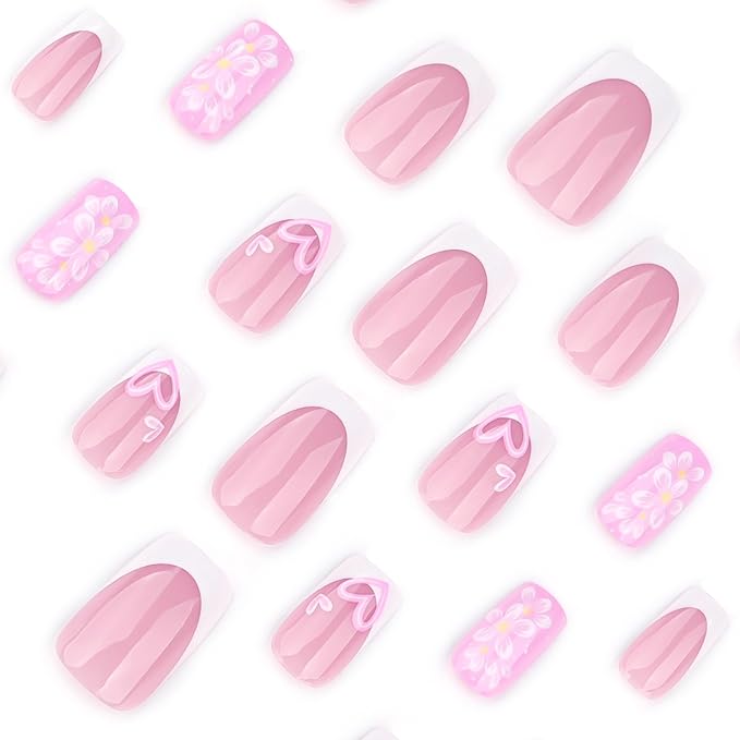 Flowers Press on Nails Square Medium Fake Nails White French Tip False Nails Pink Glossy Full Cover Glue on Nails Heart Artificial Stick on Nail for Women Manicure DIY