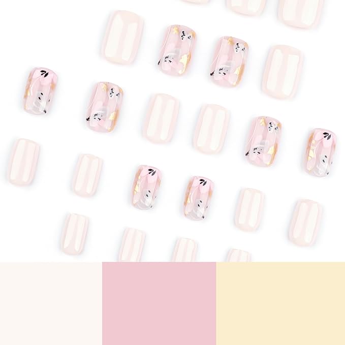 Flowers Press on Nails Square Short Fake Nails with Designs Gold False Nails Nude Glossy Full Cover Acrylic Nails Spring Glue on Nail Cute Artificial Stick on Nail for Women Manicure DIY