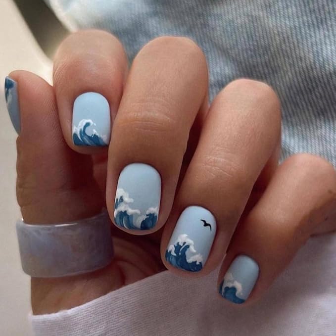 Short Press on Nails Square Fake Nails Blue False Nails Summer Nail Wave Glossy Full Cover Acrylic Nails Glue on Nail Artificial for Women Manicure 24Pcs
