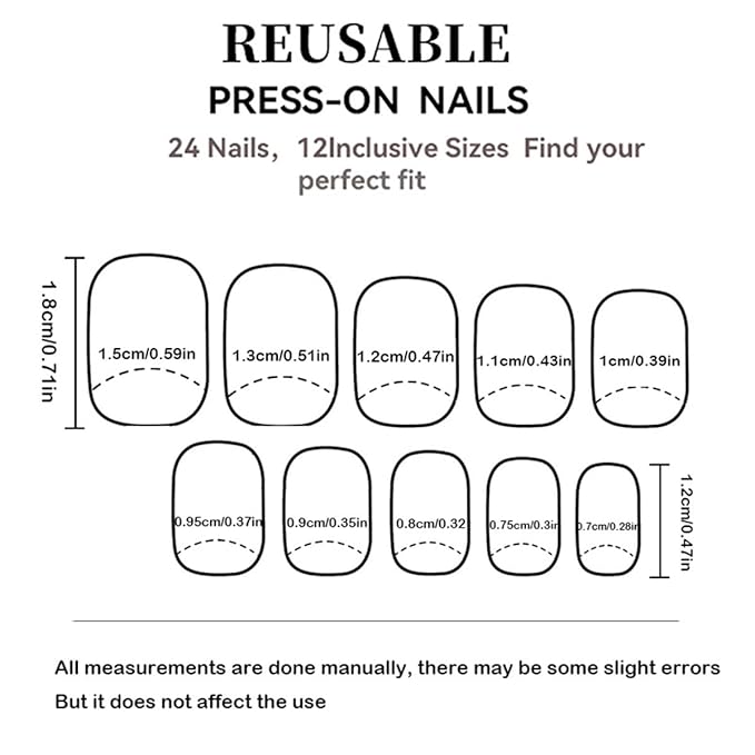 - Perfect Gift:Press on nails short square is a perfect gift for girlfriend,wife,friends and relatives.The short square nails are easy to use.You can also trim the nail shape you want by yourself.You may easily change your acrylic rhinestones nails to match your outfit style