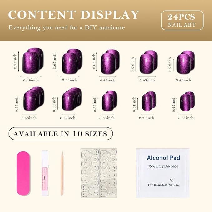 Cat Eye Purple Press On Nails Short Square, Designer Reusable Acrylic Fake Nails with Glue, Glossy Soft Gel Nails Wedding and Party, Stick On Glue On Nails, Nails Press Ons fro Women