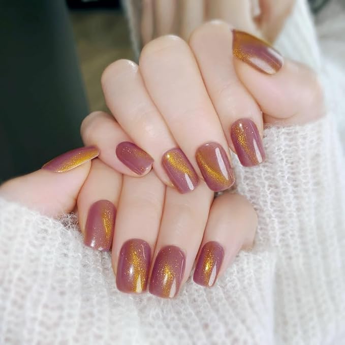 Cat Eye Purple Pink Press On Nails Short Square, Designer Reusable Acrylic Fake Nails with Glue, Glossy Soft Gel Nails Wedding and Party, Stick On Glue On Nails, Nails Press Ons fro Women