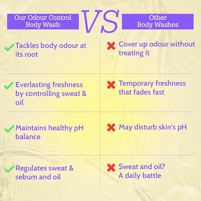 - India’s 1st Odour Control Body Wash Formulated to combat bad body odour by addressing the root cause—odour-causing bacteria and imbalanced skin pH.