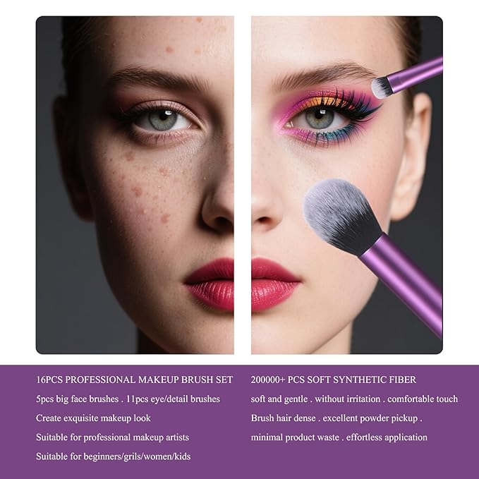- [22pcs Professional Makeup Kit] Includes 16 makeup brushes sets (5 face brushes + 11 eye/lip/detail brushes) and 6 portable tools (3 velvet powder puffs + 3 mini sponge puffs). Perfect for full-face makeup routines—from foundation and contouring to eye looks and concealing