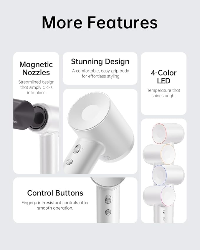 - 【Thermo Control Technology】Laifen's exclusive technology compensates excessive heat to avoid hair damage. The Thermo-Control microprocessor monitors the air temperature 100 times/s and makes adjustments to avoid your hair from being damaged by heat.