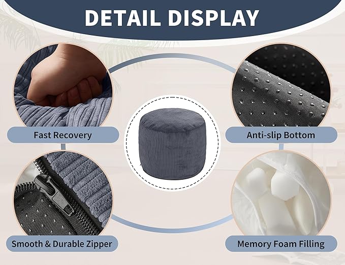 - Comfortable, Compact & Stylish Large Pouf Ottoman: Made with soft, breathable corduroy and round ottoman cover filled with high-resilience foam, this footstool ottoman (26"x26"x18") offers both comfort and support. The footrest ottoman's compact size makes it perfect for different spaces, while bean bag ottoman's versatile design fits beautifully in living rooms, bedrooms, dorms, and kids' play areas.
