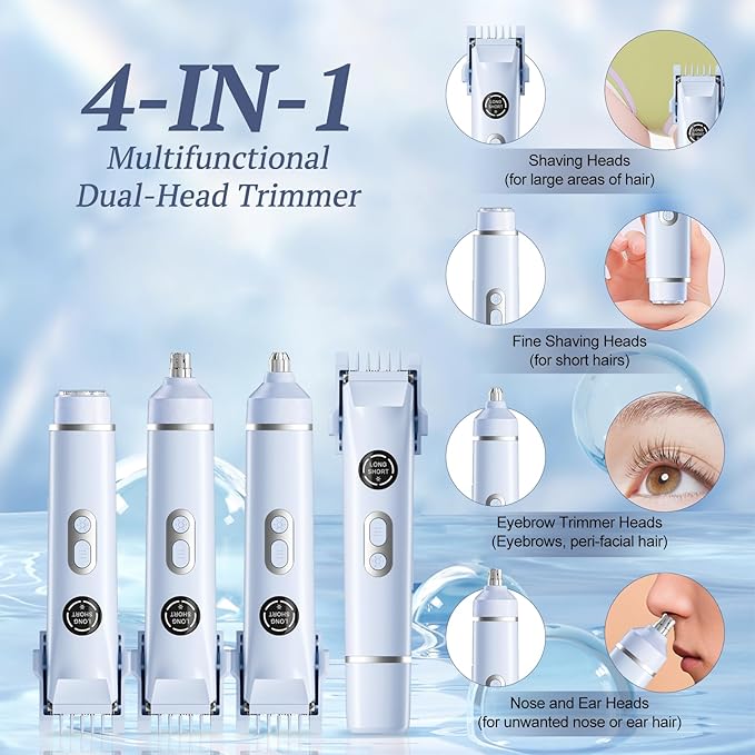 - 🌸【4 In 1 Multi-Functional Bikini Trimmer】This trimmer for women comes in a double-header, with a shaving head at the top with a length-setting comb to help you control the length of the trim, and a removable bottom section with three interchangeable trimmer heads (fine shaving head, eyebrow trimming head, and nose and ear head). This womens electric razor helps you customize the shaving results of your face, arms, legs, armpits, nostrils, and bikini area in minutes