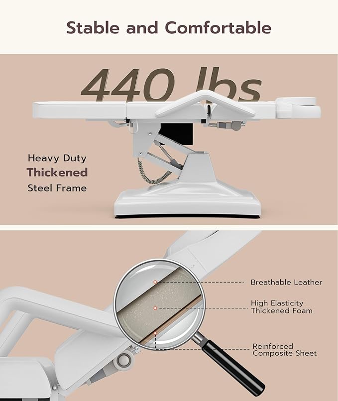 - Ultra-Stable & Durable Construction: Built with a thickened heavy-duty steel frame, this beauty bed handles high weight capacity with ease. The reinforced base resists bending and ensures stable performance. Anti-slip feet keep it steady on all surfaces. Ideal for estheticians, massage therapists, and med spa professionals seeking professional performance at an affordable price