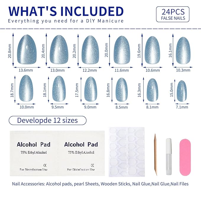 Blue Almond Press On Nails Short, Cat Eye Press on Nails with Glue for Women Ashionable Gel False Nails Reusable Acrylic False Nails Women's Glitter Nails Glue On Nails Kit Sky Blue