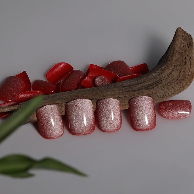 Short Square Press On Nails, Red Cat Eye Press on Nails Fashionable Gel False Nails Reusable Acrylic False Nails Women's Glitter Nails Glue Patch Nails Set, Red Water Gloss White, 24Pcs