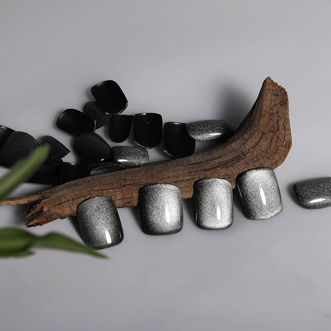 Short Square Press On Nails White to Grey Gradient Cat Eye Press on Nails with Glue for Women Ashionable Gel False Nails Reusable Acrylic False Nails Glue On Nails Kit, water gloss white