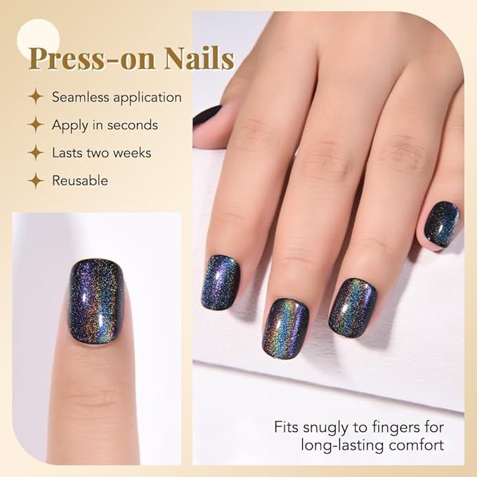 evpct Black Chrome Cat Eye Short Press on Nails Square, Short Square Glue on Nails for Women Gift, Black Metallic Glitter Glossy Reusable Spring Summer Stick Gel Press on Acrylic Fake Nail with Design