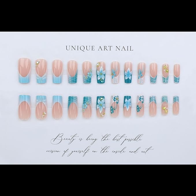 Medium Press on Nails Square Blue Flowers Stick on Nail for Women 24pcs