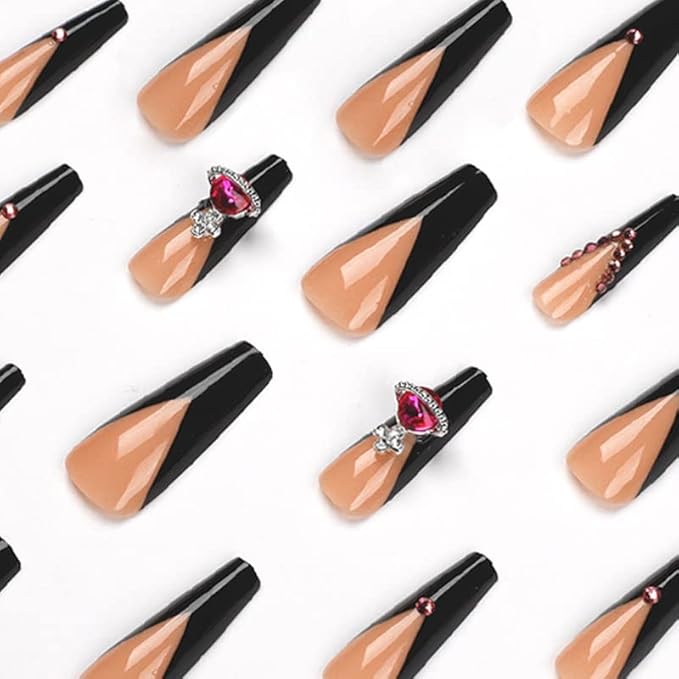 Long Press on Nails Square Fake Nails French Tip False Nails Black Artificial Nails with Designs Stick on Nails for Women 24pcs