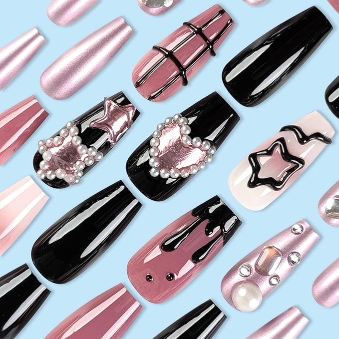 Medium Press on Nails Square Fake Nails Black False Nails with Heart and Star Designs Artificial Nails Stick on Nails for Women 24pcs