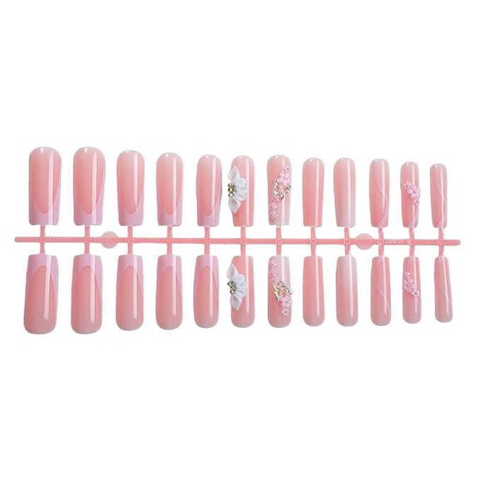 Long Press on Nails Square Fake Nails French Tip False Nails Pink Artificial Nails with Flowers Designs Stick on Nails for Women 24pcs