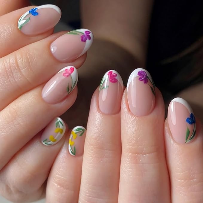 IMRAIN Medium Almond Press on Nails Flower French Tips Fake Nails Glossy Acrylic Nails Press ons with Floral Designs White Nail Kit Spring Summer Glue on Nails for Women 24Pcs