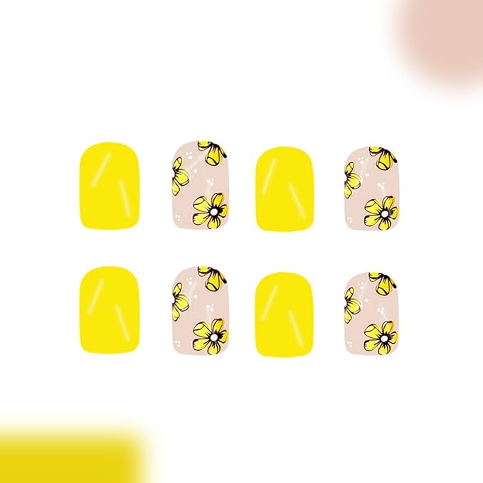 - High Quality & Durable:Full cover yellow nails press ons are made of high quality acrylic material, the yellow press on nails flowers tips are elastic and durable, not easy to break. The surfaces of the flowers nails press ons all have a high-gloss protective gel finish, even after multiple uses, the gel and patterns on the nail art surface are not easy to wear
